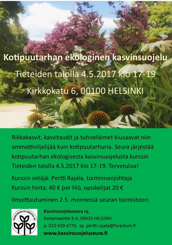 Rikkakasvit, kasvitaudit ja tuhoeläimet kiusaavat niin ammattiviljelijää kuin kotipuutarhuria. Kasvinsuojeluseura järjestää kotipuutarhan ekologisesta kasvinsuojelusta kurssin Tieteiden talolla 4.5.2017 klo 17-19. Tervetuloa! Kurssin vetäjä: Pertti Rajala, toiminnanjohtaja Kurssin hinta: 40 € per hlö, opiskelijat 20 € Ilmoittautuminen 2.5. mennessä seuran toimistoon: Raitamaantie 8 A, 00420 Helsinki p. 010 439 4770, sp. pertti.rajala@forestum.fi |